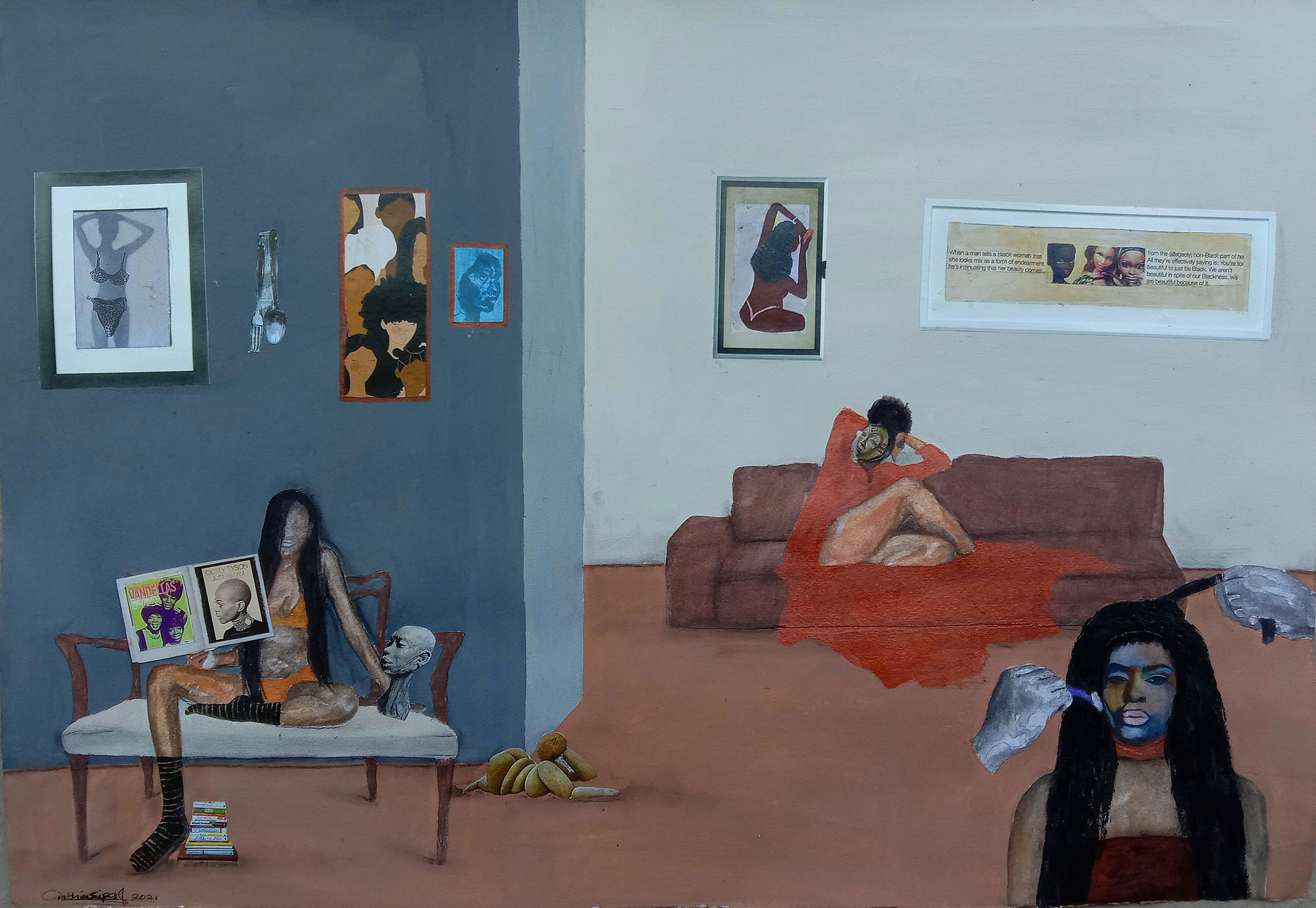 “My work explores beauty constructs through my lived experience as an African woman and those around me. I create moments within domestic spaces by using different mediums like acrylic with oil paint, charcoal, ink, collage from personal photographs and magazines. Female silhouettes represent the "perfect women " perceived by society through social media. The moments I create in domestic spaces are dialogues between perceived beauty standards, and stereotypes which function to both challenge and embrace African women. The Barbie doll, a primary inspiration in my work, is used with other feminine objects or symbols with associations to African women, representing thoughts, misconceptions, perceptions and emotions. These spaces allow me to create conversations and interrogate notions of beauty,” says Mulanga.